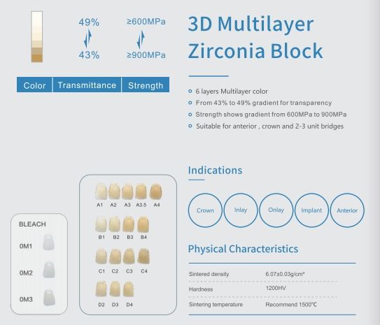 Yucera 3D Plus多層ジルコニアブロックは、天然の色調グラデーション(濃色から淡色)、可変強度(1050MPa~700MPa)、および単一ブロック内で頸部から切歯部までの制御された透過性(43%~57%)を特徴とする、最高クラスのジルコニア材料です。